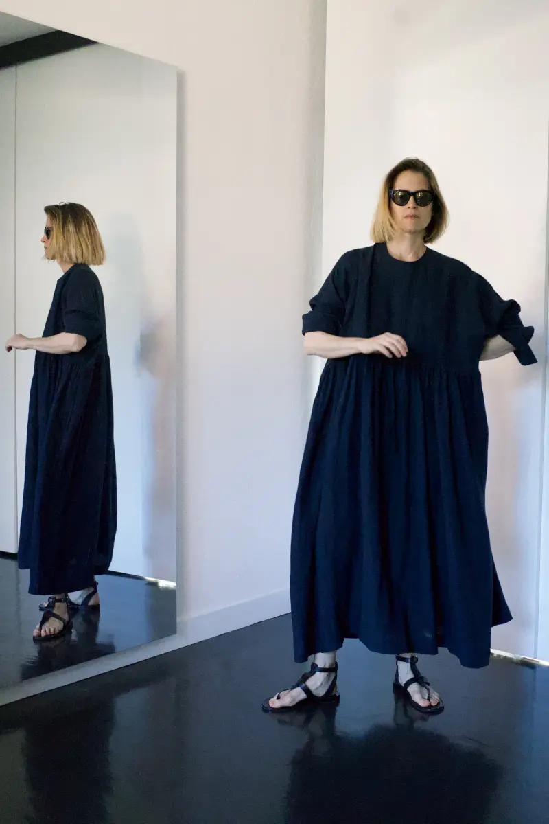 Flowy round neck dress with adjustable drawstring waist – style it loose or cinched for effortless, relaxed elegance.