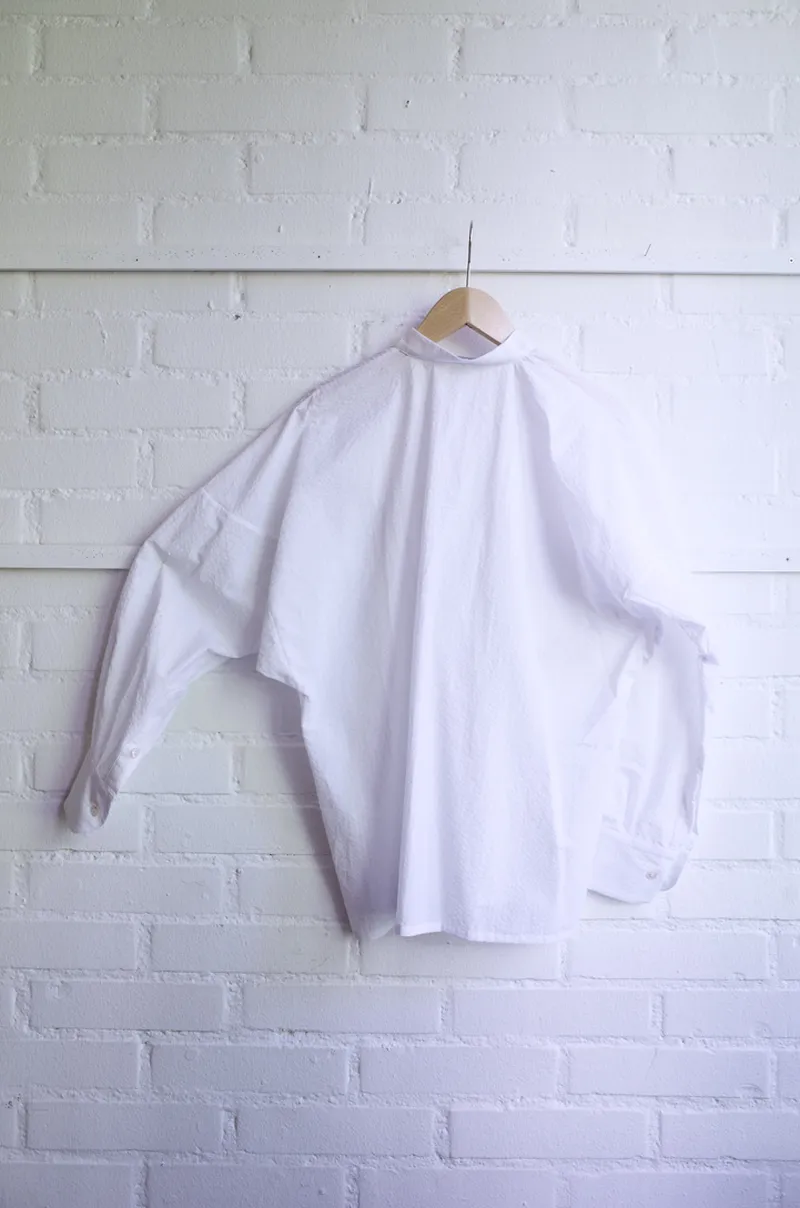 Roomy button-up shirt with a single breast pocket, finished with mother of pearl buttons.