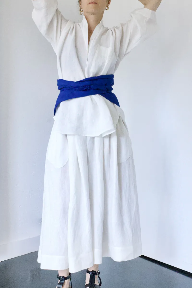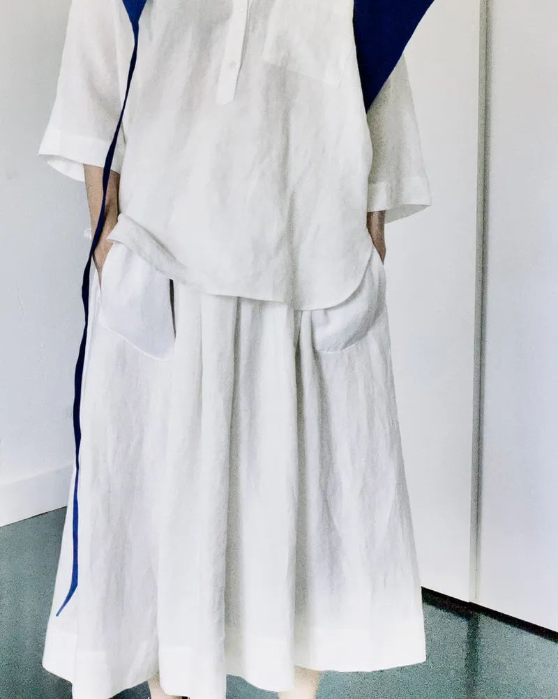 Wide linen skirt with elastic waistband and two front pockets.